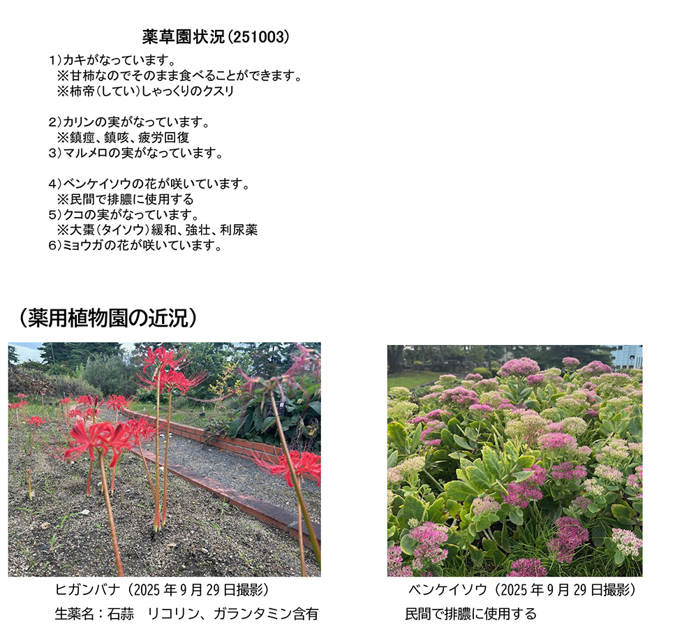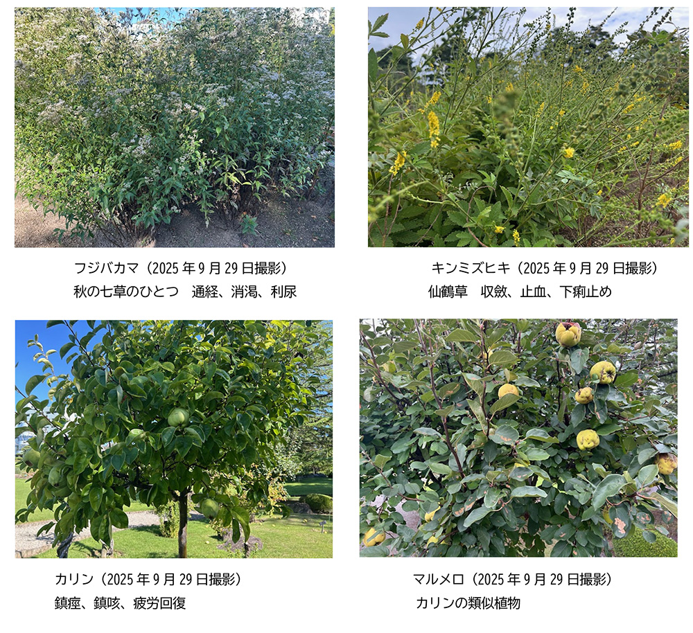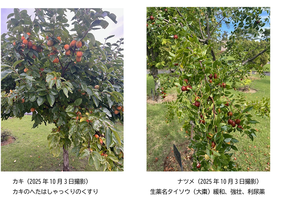 ヒガンバナはアルツハイマー型認知症治療剤ガランタミンを含みます。ベンケイソウは民間で排膿薬として使われます。フジバカマは糖尿病による口の渇きなどに用いられます。キンミズヒキはゲンノショウコと同様に下痢止めに用いられます。カリンはカリン酒などとして疲労回復に用いられます。柿のへたはしゃっくりの妙薬です。ナツメは大棗(タイソウ)として漢方処方中に多用されます。